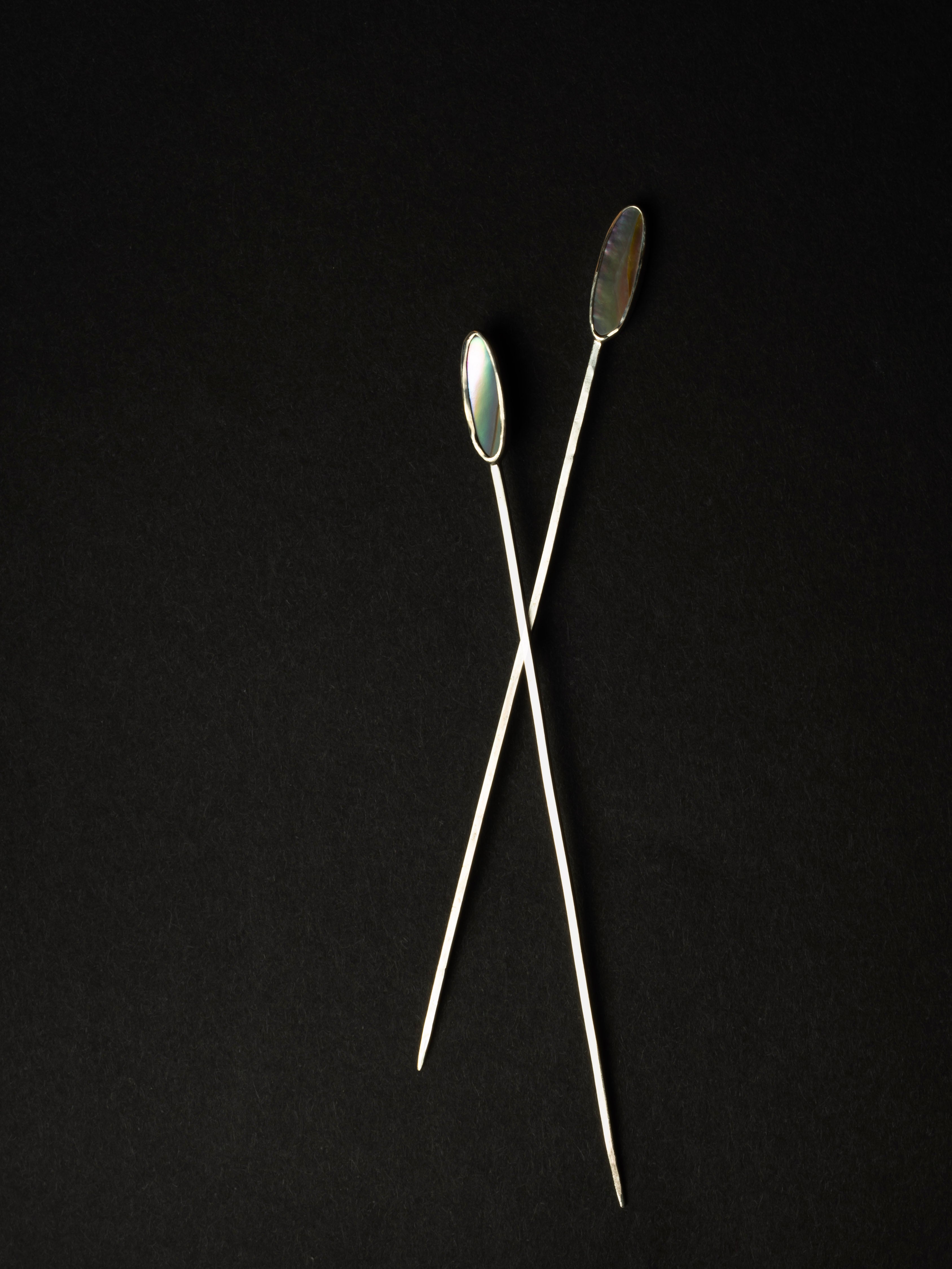 Solid sterling silver cocktail pick set with abalone. Individually handmade so each is a little different. ~4 inches long.