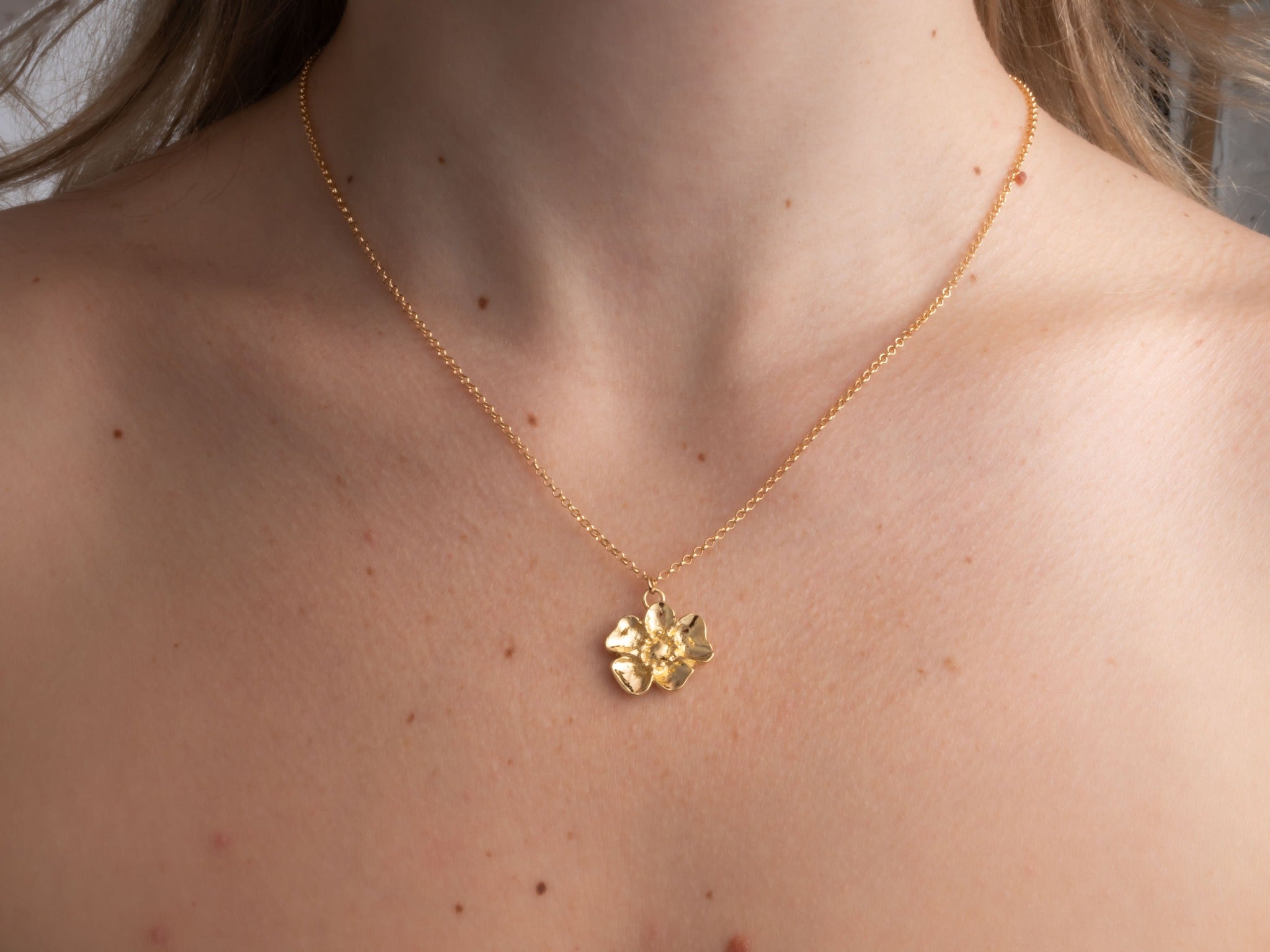 Flower pendant necklace on fine 18" chain with lobster clasp available in solid sterling silver, or brass with a thick 14k gold plating.