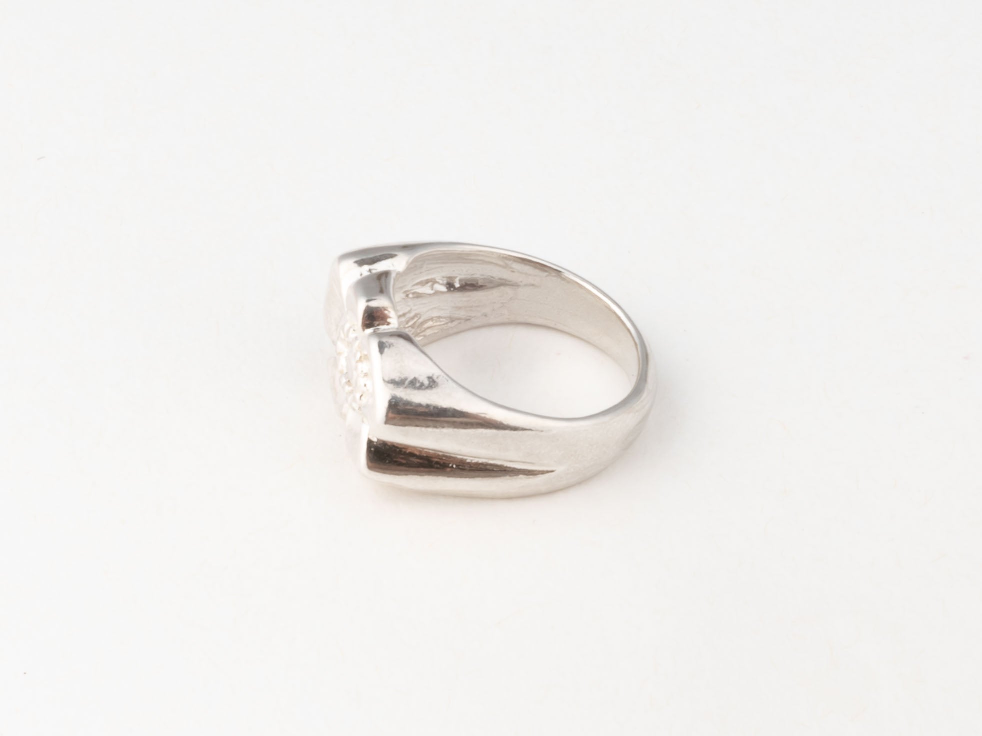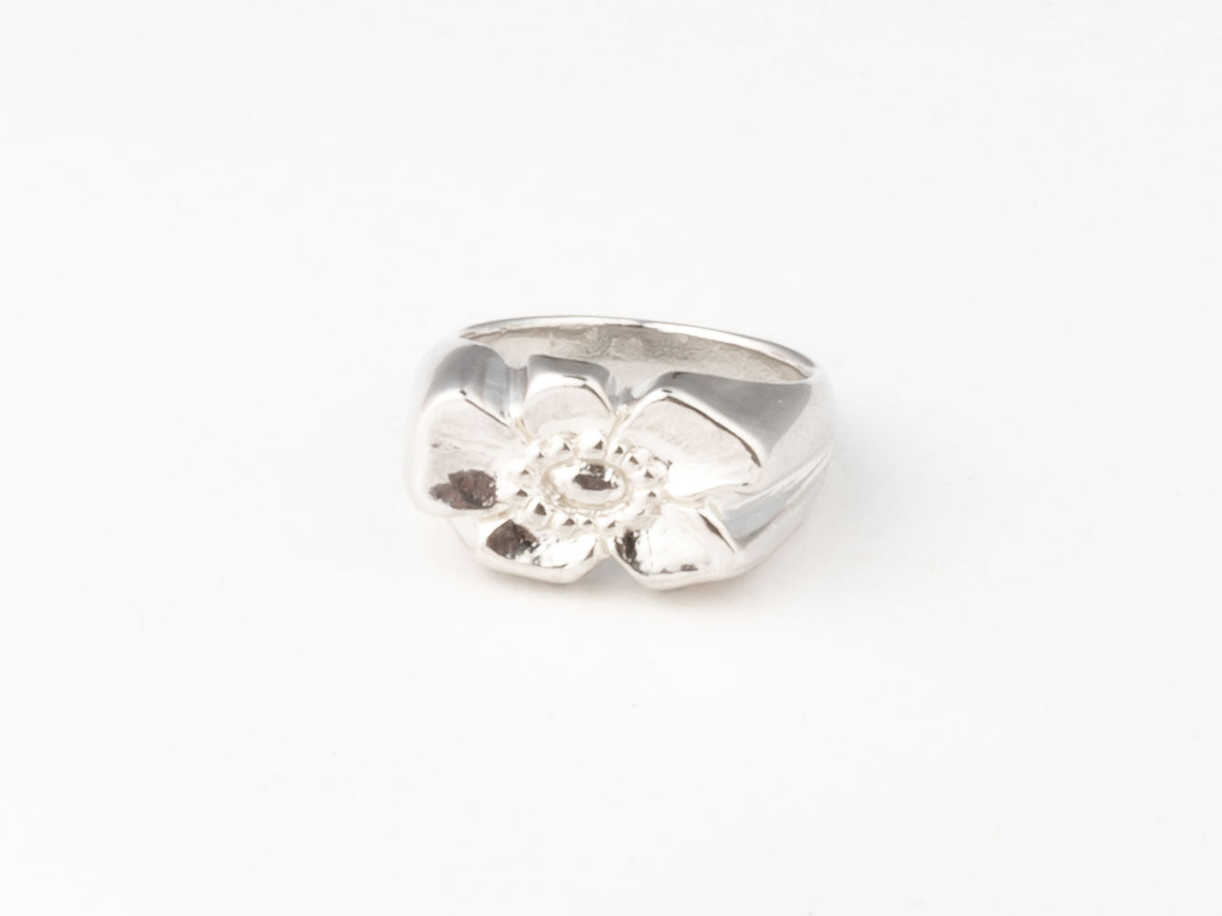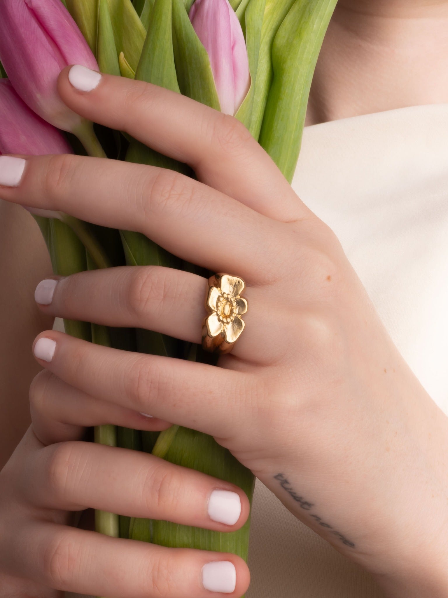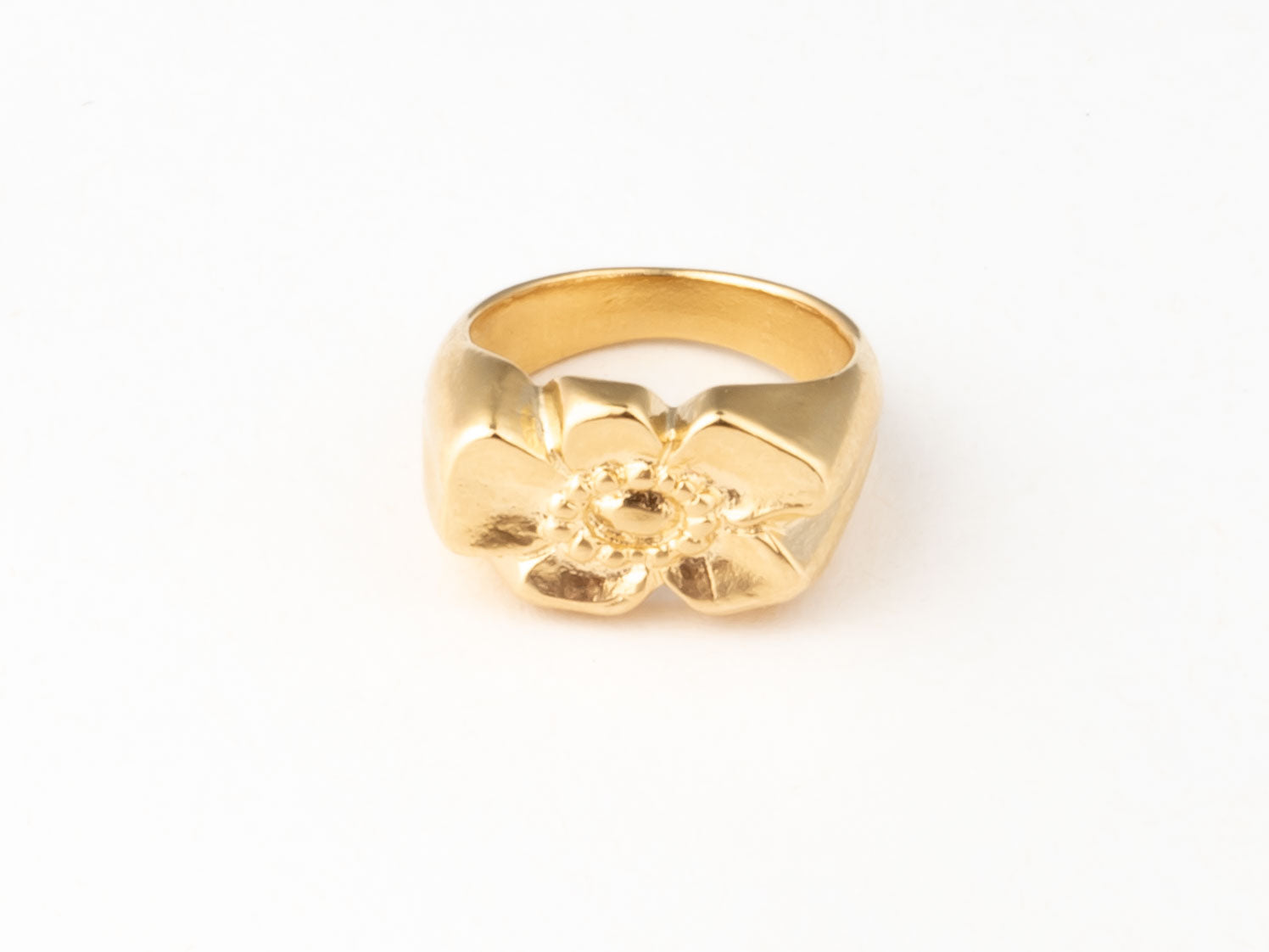 Chunky signet shaped flower ring in solid sterling silver or brass with a thick 14k gold plating.
