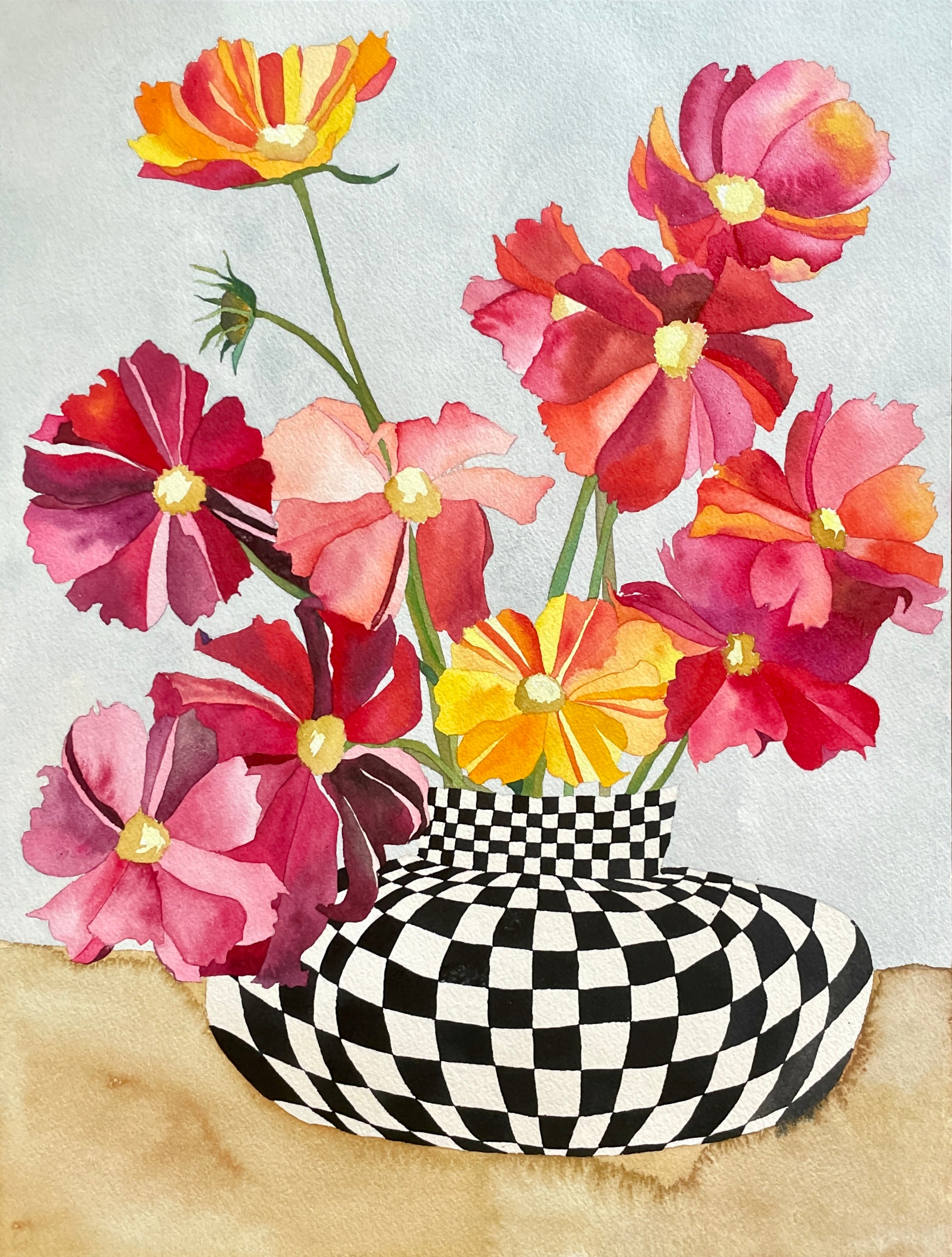 Watercolor on Arches paper of cosmos in a checkered vase. 11x14inches