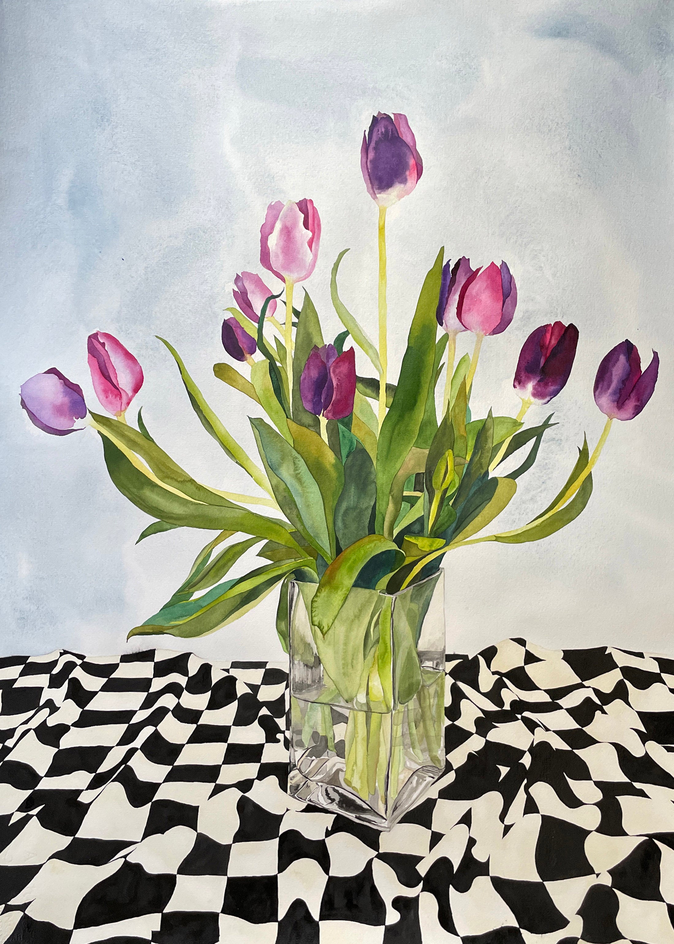 22x30 Watercolor painting of purple tulips on deckled Arches paper.