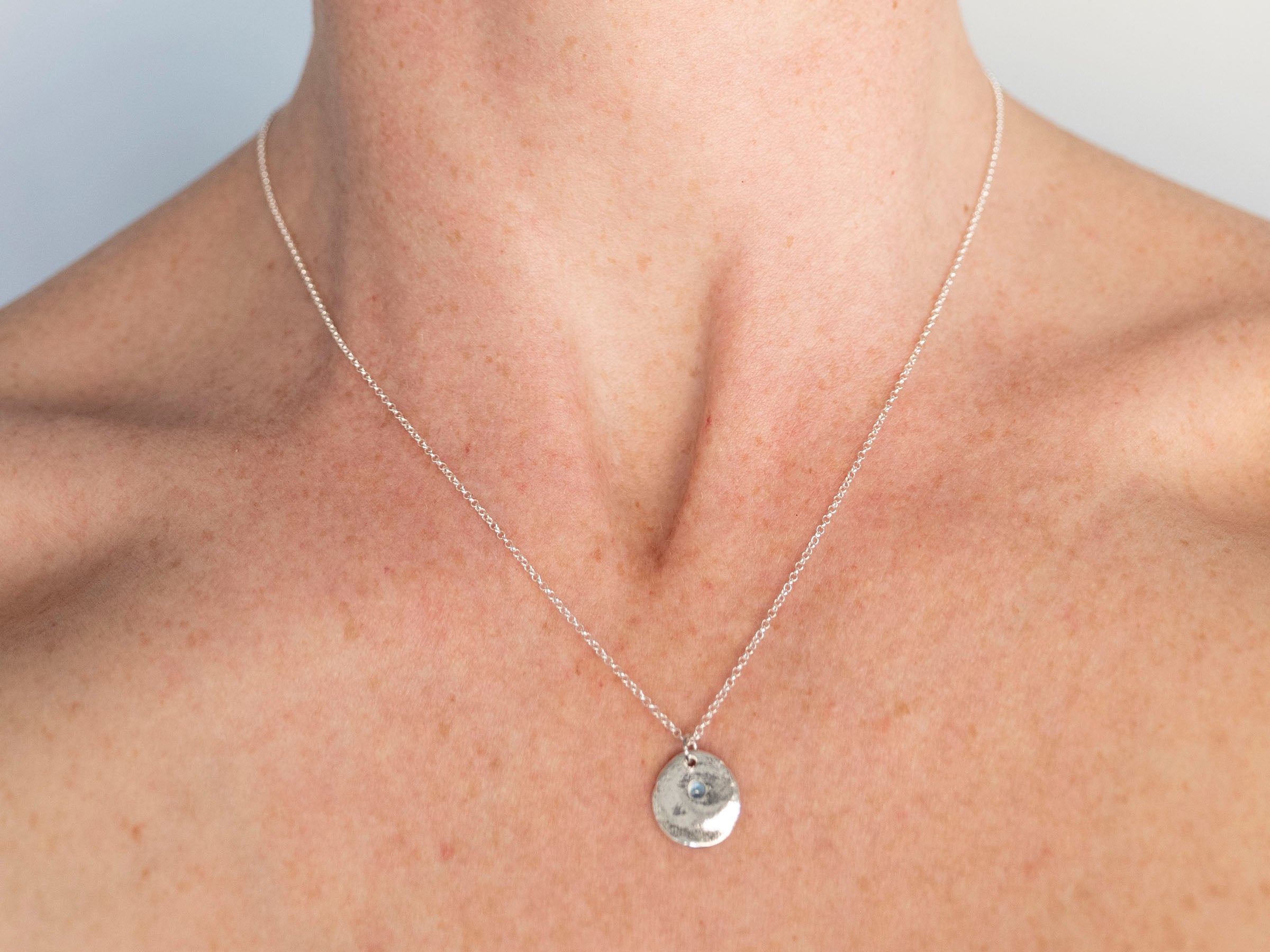 Each small silver disk is set with a single sapphire, placed intuitively rather than as a focal point. Slight variations in surface and proportion are part of the piece and reflect the way it was made. No two are exactly alike.